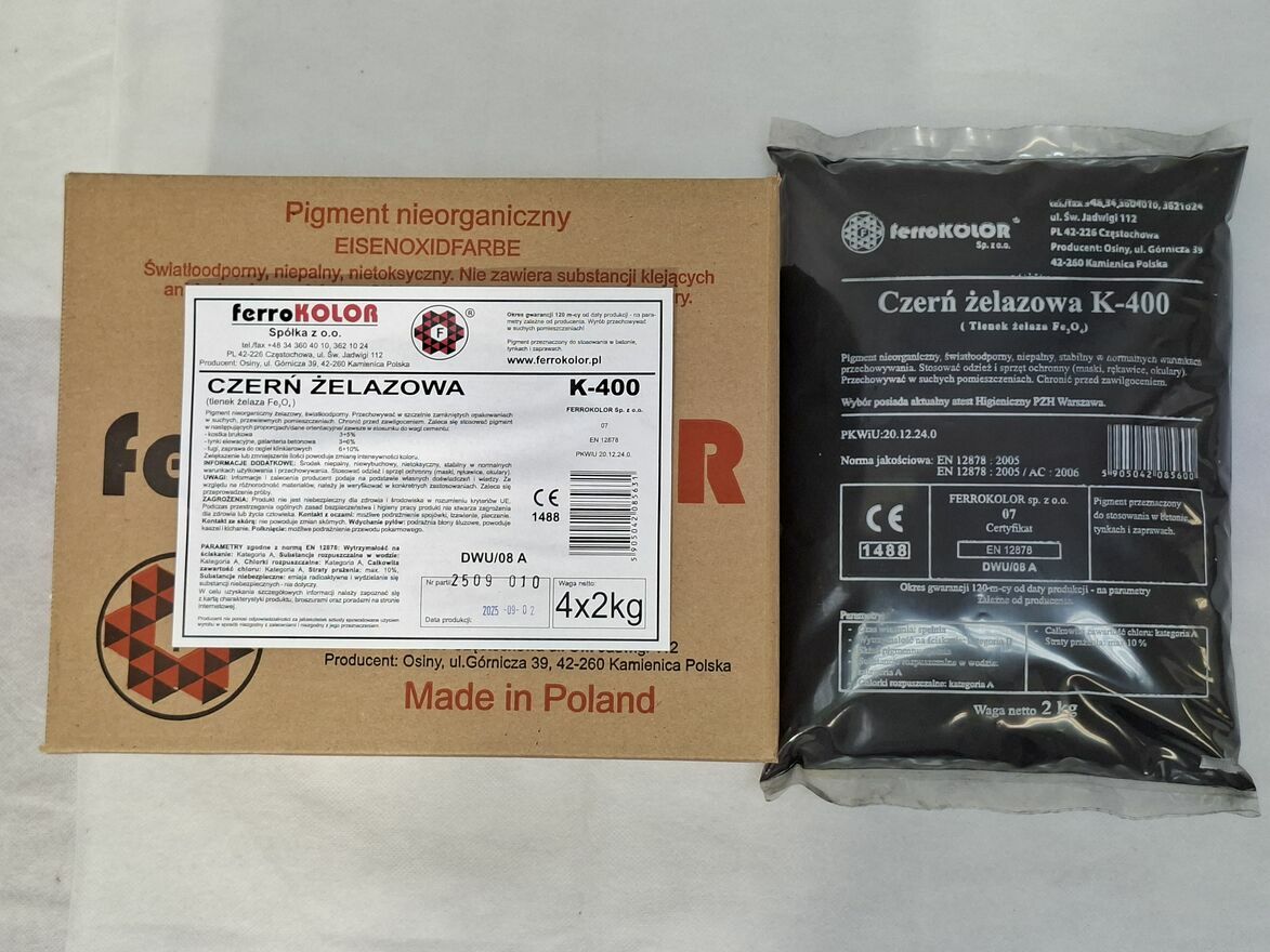 Pigment żelazowy czarny K400 o wadze 2 kg. Produkt przeznaczony do barwienia wyrobów betonowych, zapraw budowlanych, tynków, farb i lakierów, tworzyw sztucznych, gumy, asfaltu i innych.