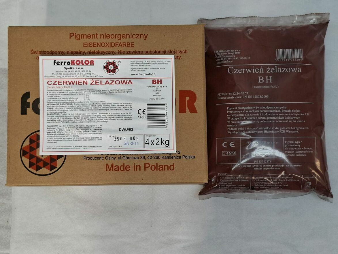 Pigment żelazowy czerwony BH o wadze 8 kg. Pakowany w kartonie (4x2kg). Produkt przeznaczony do barwienia wyrobów betonowych, zapraw budowlanych, tynków, farb i lakierów, tworzyw sztucznych, gumy, asfaltu i innych.